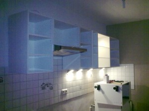 Die Dunstabzugshaube wurde beim Aufhängen dann auch direkt angebracht – so war es einfacher, dass Kabel hinter den Schrank zu legen. Durch den nur halbhohen Fliesenspiegel ergab sich allerdings ein Aufhänge-Problem: die Faktum-Schränke haben nicht, wie „normale“ Küchenhängeschränke dieses Kästchen für den Haken, mit denen Unebenheiten an der Wand ausgeglichen werden können, weil sie nicht ganz hereingeschraubt sind, sondern werden mit normalen Schrauben befestigt. Wir haben uns dazu entschieden, Leisten zwischen Wand und Schränke zu setzen und deswegen die Schränke mit sehr langen Schrauben (6,0 x 100) angebracht. Die halten! Nix wackelt und die Wände hier sind zum Bohren auch genial (hatte schon in anderen Wohnungen welche, wo ein 6er Bohrer ein 10er Loch gebohrt hat, dass aber nur 1,5cm tief wurde… möööp)